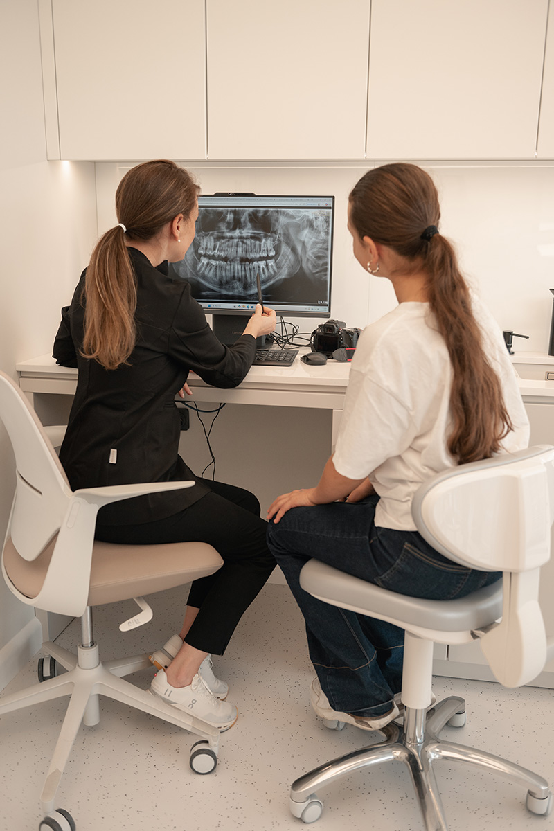Przeprowadzamy konsultację mającą na celu określeni stanu zgryzu i stanu uzębienia. Wykonujemy na miejscu pełną diagnostykę RTG oraz omawiamy możliwości leczenia i oczekiwane efekty.